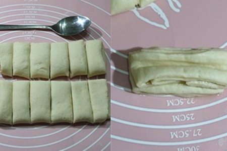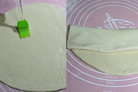 三、发酵好的面团用擀面杖轻按排气,擀成长方形的薄饼,饼的厚薄要尽量均匀,在饼上刷一层葱油,您还可以根据自身口味加入盐、五香粉或者麻酱、葱花等等,然后把面片卷起来,将卷起来的面团切成小块。