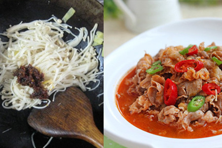 第四,待到汤汁煮好下金针菇,煮软后盛起备用。原有的锅入肥牛烫至变色即可捞起与金针菇装在一起,并将汤汁也一同倒入,按个人口味入蒜末、葱末、热油即可享用。