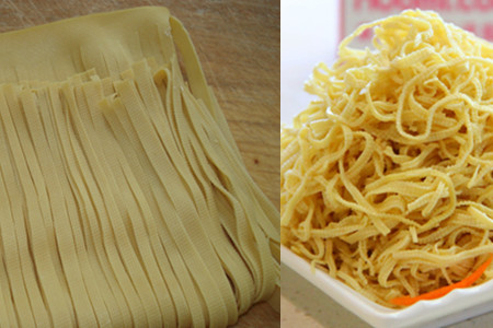 首先,我们需要将一摞食材放在菜板上,然后用刀将它们切成条状。