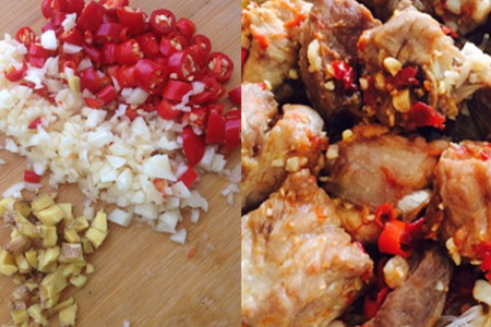 将排骨切成段状洗干净以后将上面的水渍沥干净留在一边备用。将大蒜和生姜、辣椒切碎。