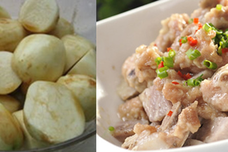 准备好芋头,将上面的泥土洗干净以后,还需要削皮干净,然后用盐腌制一会儿,这样蒸的时候排骨不容易散开。