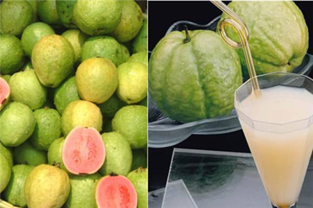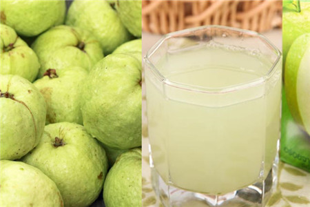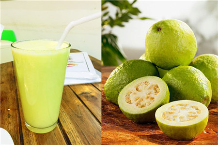 方法一:将番石榴洗净之后,用刀切成小块,将果肉放入榨汁机中,倒入一定量的矿泉水或者凉白开,放入一点冰糖和蜂蜜,加入少量冰块即可。