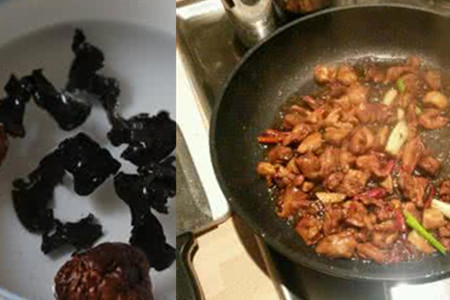 接着,利用锅底的油,加入木耳和香菇翻炒,再倒入之间煎好的鸡肉。加适量的盐,与鸡肉一起翻炒入味。