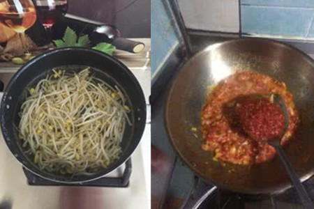 然后,把番茄放入沸腾水开的锅中,稍微烫一下,再把番茄的表皮剥皮。把海带打结切成一一的段状,再把豆芽放入锅中焯一遍水。把竹笋、藕片、海带结都稍微焯下水。