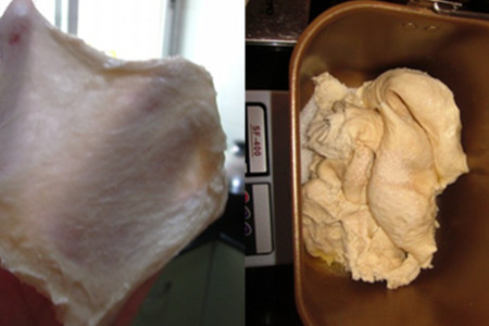 将面团全部放到面包机中,并让面包机自动揉面15分钟。揉好的面团已经很细腻了。这时候将面团拉成如图的薄饼状,这有助于我们接下来的制作。如果,你发现薄饼中会出现很不均匀的颗粒,可以将面团在放入面包机再次糅合。
