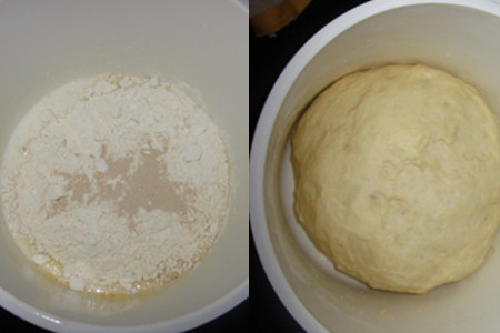 下面我们需要做的就是等待面团发酵,将面团放入冰箱中并盖上保鲜膜,发酵至少24个小时。这时候如果发现,面团已经长大到原来的3倍,就可以拿出来做下面的步骤了。将面团拿出来和蛋白以及奶粉一起搅拌(一定要均匀)。