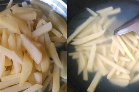 看完食材接着就是制作过程了。将土豆洗干净去皮,切成长条状。切的时候要注意,粗细要均匀,现在有专门切薯条的刀具,如果有条件的可以购买。切好的薯条先要在清水中浸泡(这一步很关键),一般需要浸泡好几次,等水不再浑浊就可以了。