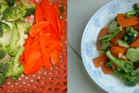 西兰花和胡萝卜都需要切成大小合适的块状,大蒜将它拍碎。