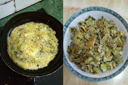 六、等到鸡蛋液凝固以后,迅速的将鸡蛋翻面,可以借助铲子,让鸡蛋两面金黄。