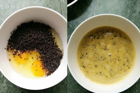 四、将蛋液从冷藏室取出,在室温条件下放置十五分钟,这时候黑松露的香味已经充分发挥出来了,加盐搅拌均匀。