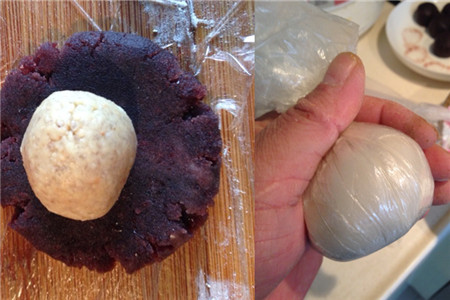 分成等分小块,在保鲜袋上面压扁,将馅料放在上面,利用保鲜袋将其包起来。