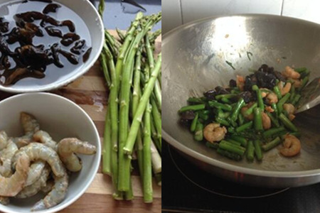 然后,热锅倒入足够的油,先将虾仁在锅中炒熟,再捞起倒入芦笋和木耳,用大火翻炒一会儿。