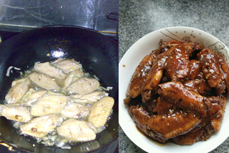 之后再拿出炒锅倒入少量食用油,放入姜丝爆香,倒入鸡翅煎炸,直到鸡翅呈金黄色即可。