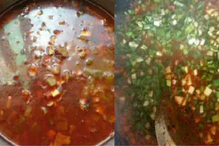 将锅中放入少许的油,先炒豆角和胡萝卜。炒熟后放入黄菜、木耳、豆腐。加入一些生抽之后继续翻炒,炒熟后装入盘中。锅里继续倒入一些油,加入适量食盐。油锅烧热后,顺着锅的外沿倒入香醋。再倒入姜丝,将醋烧开。再将锅内倒入半锅清水。放上刚才炒好的配菜。放入胡椒粉和十三香。再放入肉臊子。将这个汤汁煮沸。关火之后放入鸡蛋和韭菜。