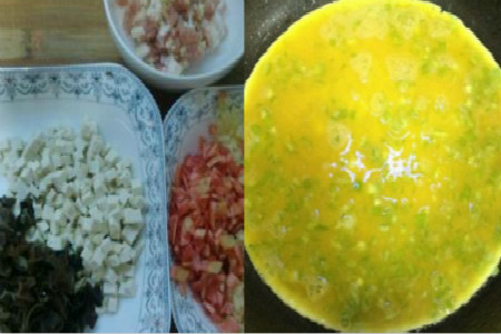 木耳及黄花菜用水泡发、洗干净。分别将它们切成小丁。长豆角切丁、胡萝卜、豆腐切成小丁。把姜切成丝,备用。鸡蛋磕入碗中,打散。将锅中稍微放一点点油。把鸡蛋摊成鸡蛋饼。之后切成小的菱形块。韭菜洗净切成小段。
