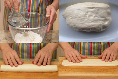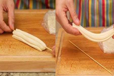 步骤3:在案板上撒上面粉,将面团放在案板上拖拉成长条,用擀面杖将面团擀成约1厘米厚的长条,再用刀切成1.5厘米宽的长条,将两条叠在一起,用筷子在中间压一下。