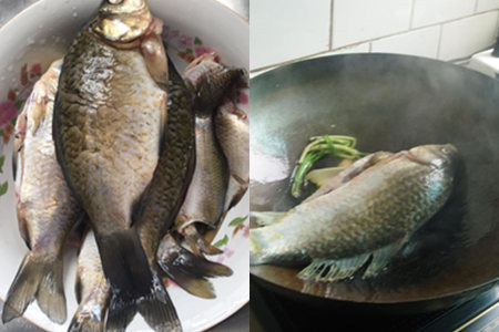 第三步:准备一口干净无水的锅,放入少量的油,用一片生姜将油涂开在锅底。用中火热锅,放入鲫鱼,煎至两面金黄即可。