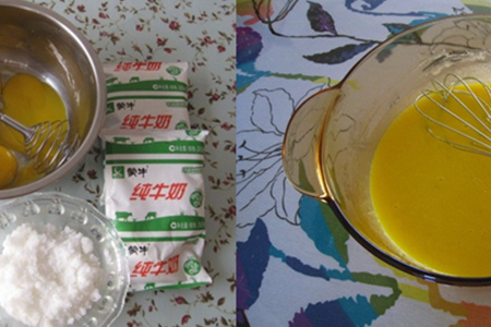 然后把牛奶慢慢的倒入之前打好的蛋黄液中。这里要注意不能将牛奶一次性全部倒入蛋黄液,不然牛奶的温度会将蛋黄烫熟,蛋黄就会结块。边倒边用打蛋器搅拌均匀,将牛奶全部倒入蛋黄液中搅匀就可以了。