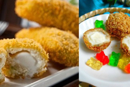 将鸡蛋的蛋黄放入碗中,蛋清不要。然后取出冷冻好的吐司球,均匀的裹好蛋黄液,然后再裹一层薄薄的面包糠。接着在锅中放油,等到油烧热后,将裹好的吐司球放入油中炸至金黄。这样一款外酥里滑,外热里冷的口感极好的油炸冰淇淋就做成了,注意一定要趁着吐司皮非常脆的时候吃哦。【女物原创未经允许,谢绝转载!】