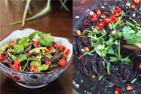 然后,在蕨根粉中加入蒜水、小米辣、老抽、陈醋、香菜等,淋上橄榄油搅拌均匀,一道凉拌菜就做好了。