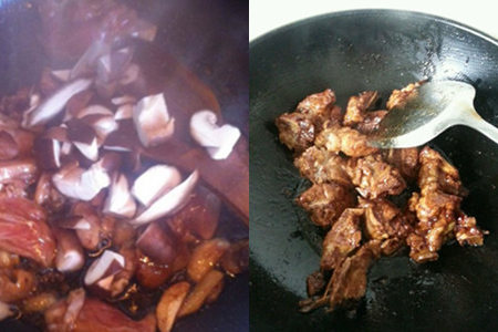 第六步:放入腌制好的鸡肉,翻炒两分钟后,再放入香菇,继续翻炒一会儿,加入适量的清水,盖上锅盖,用大火焖煮,等待五分钟。