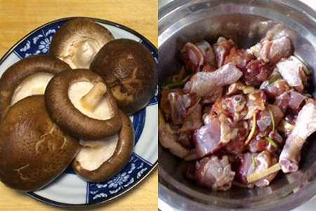第一步:准备食材。主要食材是新鲜鸡腿两只,新鲜香菇六个,辅助食材是生姜三片,生粉,料酒,食用盐,食用油。