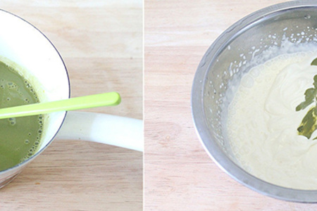 开小火,将搅拌均匀好的蛋奶液放入火上,加热至蛋奶液变热即可,不要将蛋奶液煮沸腾。在小碗中倒入抹茶粉加入小部分的蛋奶液,将抹茶粉调成抹茶酱。然后把抹茶一下倒入蛋奶液之中搅拌均匀,直至整个蛋奶液都成抹茶绿颜色,然后将抹茶蛋奶液放置一旁备用。
