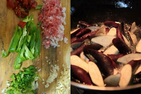 第一步:准备食材。主要食材是茄子300克,瘦肉200克,辅助食材是蒜头三瓣,葱一根,香菜两根,生姜三片,盐,油,酱油,生粉。
