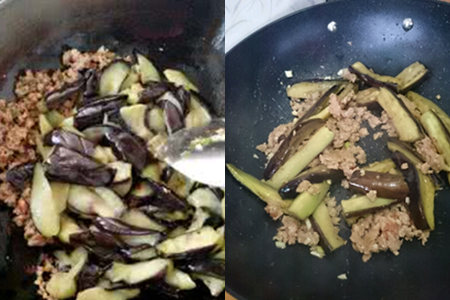 第七步:然后放入茄子,翻炒三分钟,加入适量的清水,盖上锅盖,用中火焖煮二十分钟。