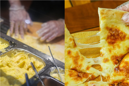 当然还有适量的橄榄油、纯净水、芝士、芝士粉以及这道美食的主角——榴莲肉。首先将高筋面粉、低筋面粉、橄榄油与干酵母搅拌揉成面团。将面团放到比较温暖的地方进行发酵,开始制作披萨的馅料。将奶酪加热搅拌,榴莲肉压制成泥,芝士刨成丝状。