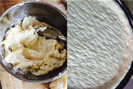 然后将面团擀成饼状放入盘子中,注意饼子要中间薄、四周厚,要在上面用叉子戳一些小孔。然后,我们将奶酪抹在饼子上,其次是榴莲肉泥,再撒上芝士丝,放入烤箱。等到芝士表面出现焦斑,就可以拿出来品尝了!【女物原创未经允许,谢绝转载!】