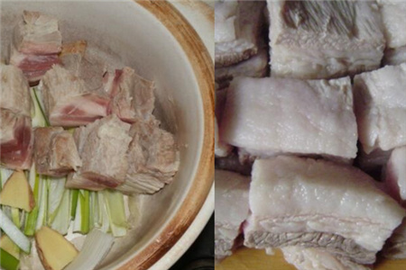 将五花肉去毛洗干净,放入清水中。开大火将水烧开,等五花肉血沫浮出后煮五分钟左右,捞出备用。将五花肉切成10个小块(大小要均匀,不然成盘不美观),将葱切成段,生姜切成薄片。