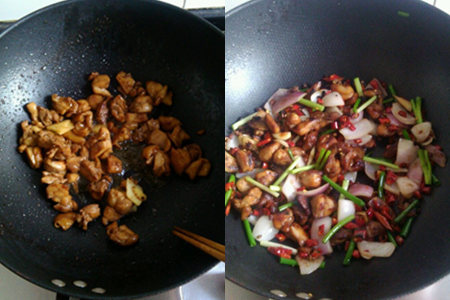 第四步:装起锅里的油,锅中剩余少许的油,放入花椒,八角,辣椒干,蒜蓉,用大火爆香之后,放入炸好的鸡肉,在翻炒的过程中,洒入适量的清水,盖锅等待十分钟。