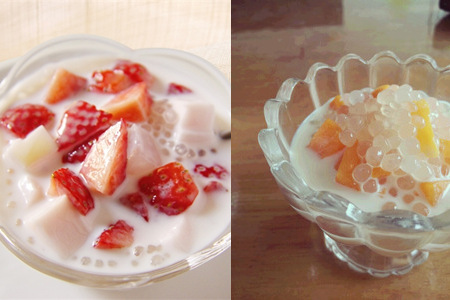Step 3:在等西米完全熟之前,我们可以先把水果切块备用。西米熟了之后出锅,倒入冷开水或冰水中,这样能使西米的口感更Q弹。然后将西米倒入碗中,放入切好的水果,加上牛奶椰汁等,这样一碗西米露就做好了,还可以加入雪糕之类的增加口感。