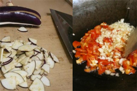第三步:在炒锅里放适量油把咸鱼、肉条、蒜末、辣椒炒熟炒香,放入茄子煸炒均匀。