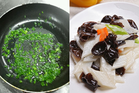 将我们事先准备好的葱花倒入锅中翻炒,直至锅中炒出香味,我们便可以将泡发好的食材倒入锅中翻炒。此时,我们再加入盐和生抽等调味品。我们也可以适当的在里面加入一些青椒或者胡萝卜等蔬菜,这样不仅可以使它看起来更有食欲,同时也会使这道菜更有营养。