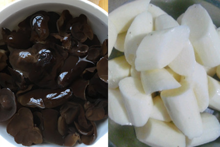 我们需要准备出山药和木耳。再将干木耳用水泡发好。因为它需要泡发一段时间,所以我们尽量要提前准备,这样可以节省时间。我们还需要将山药洗干净并去皮。