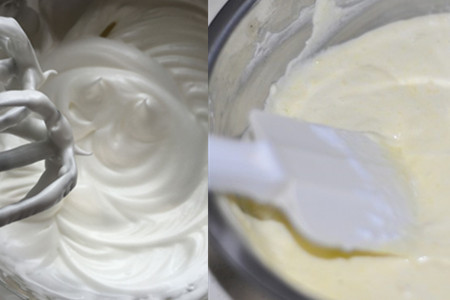 在装有蛋黄的碗里加入适量的面粉、白糖、黄油和清水一起搅拌均匀,再把之前打好的蛋清也一起放进去搅匀,使之变成面糊。