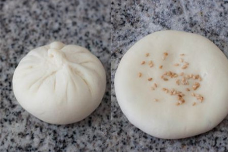 六、将面团擀成周围薄中间稍厚的圆饼,放入适量馅料,用包包子的方法收口。收口朝下放置压扁,在表面稍微涂一点水,撒上芝麻。