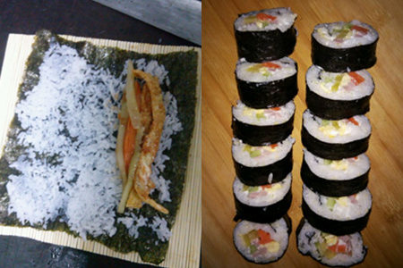 第六步:铺开寿司帘,在帘上放好紫菜,再慢慢的铺满米饭,在靠近自己的一端放好青瓜条,火腿条,鸡蛋条。