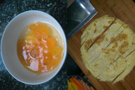 第四步:将鸡蛋打破到碗中,加入少许的盐,鸡蛋液倒入热油锅中,煎成鸡蛋饼后,切成细条。