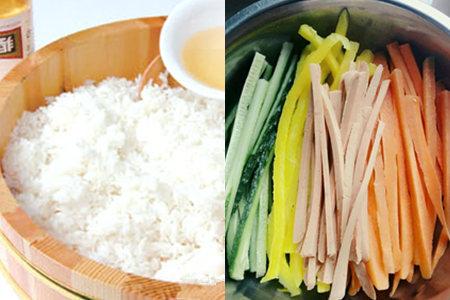 第二步:将大米洗干净后,放入电饭锅中,再加入三茶匙的寿司醋,搅拌均匀后,由着米饭煮熟。