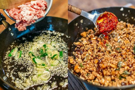 准备好材料后,起锅热油,待油热下葱姜蒜煸炒出香味,放洋葱炒至变软。再加入肉末翻炒,直到肉末变色加入口蘑丁,随后放甜辣酱和豆瓣酱继续翻炒。待所有材料都熟透了,加清水刚好没过锅里的肉末即可。调大火煮开再小火收汁,倒一些酱油,上色调味。
