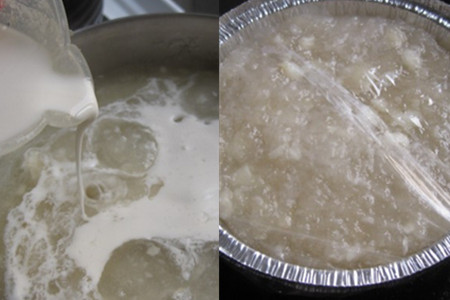 七、将马蹄糊倒进事先抹好油的容器,抹平表面敷保鲜膜隔水蒸一个小时。