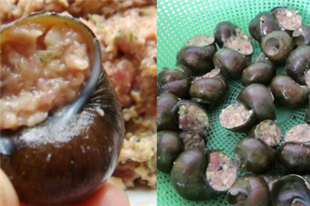 将田螺肉用刀剁碎,猪肉也同样剁碎,如果家里有料理机的话就比较方便简单了,直接用料理机打碎就可以了。将田螺肉沫和猪肉沫搅拌在一起,在加入盐和料酒进行去腥调味,然后将混合肉沫顺着一个方向搅拌,这样可以让肉沫上劲口感更佳。将混合肉沫塞回田螺壳里去,一般塞到8成满就可以了,用田螺盖子盖住。