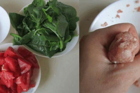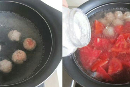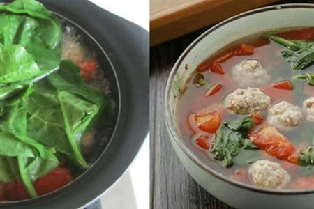 接着在锅里加入清水,等水烧开了之后左手拿一团搅拌均匀的肉末从虎口挤出肉丸放进开水锅里煮,等肉丸全部放进锅里之后我们再把番茄切成小丁快一起放入锅中煮,等到肉丸全部浮出水面之后再加入木耳菜,木耳菜放进锅里滚一下即可起锅。起锅的时候再加入盐、味精、胡椒粉和撒上葱花即可享用了。
