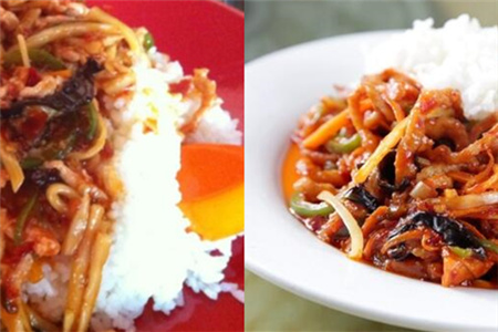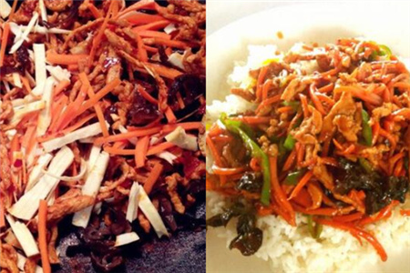 鱼香肉丝其实本身就是一道菜,和白饭配在一起就变成了鱼香肉丝盖浇饭。这道美食的特点十分突出,其味道酸中带辣,开胃可口;色泽也十分的诱人,加上多种蔬菜和少量的肉类,既补充的维生素和粗纤维还提供了足够的蛋白质。
