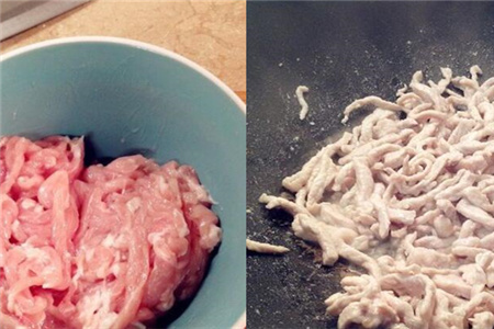 下面进行煸炒,先将腌制好的肉丝放入油锅中煸炒至半熟,取出放在一边。将锅洗干净后再次倒入食用油将胡萝卜丝和木耳丝一起放下去煸炒,加入豆瓣酱和泡椒。