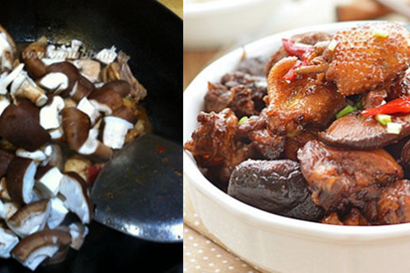 选择新鲜的香菇,将它切成大小均匀的块状。购买回来的新鲜鸡肉,用刀将它剁成块状,还需要准备一些姜片、桂皮、八角、干辣椒、香葱以及一些日常必备的调味品。