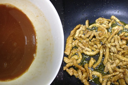 肉丝放在锅中翻炒至金黄色,不要炒太久,及时出锅。